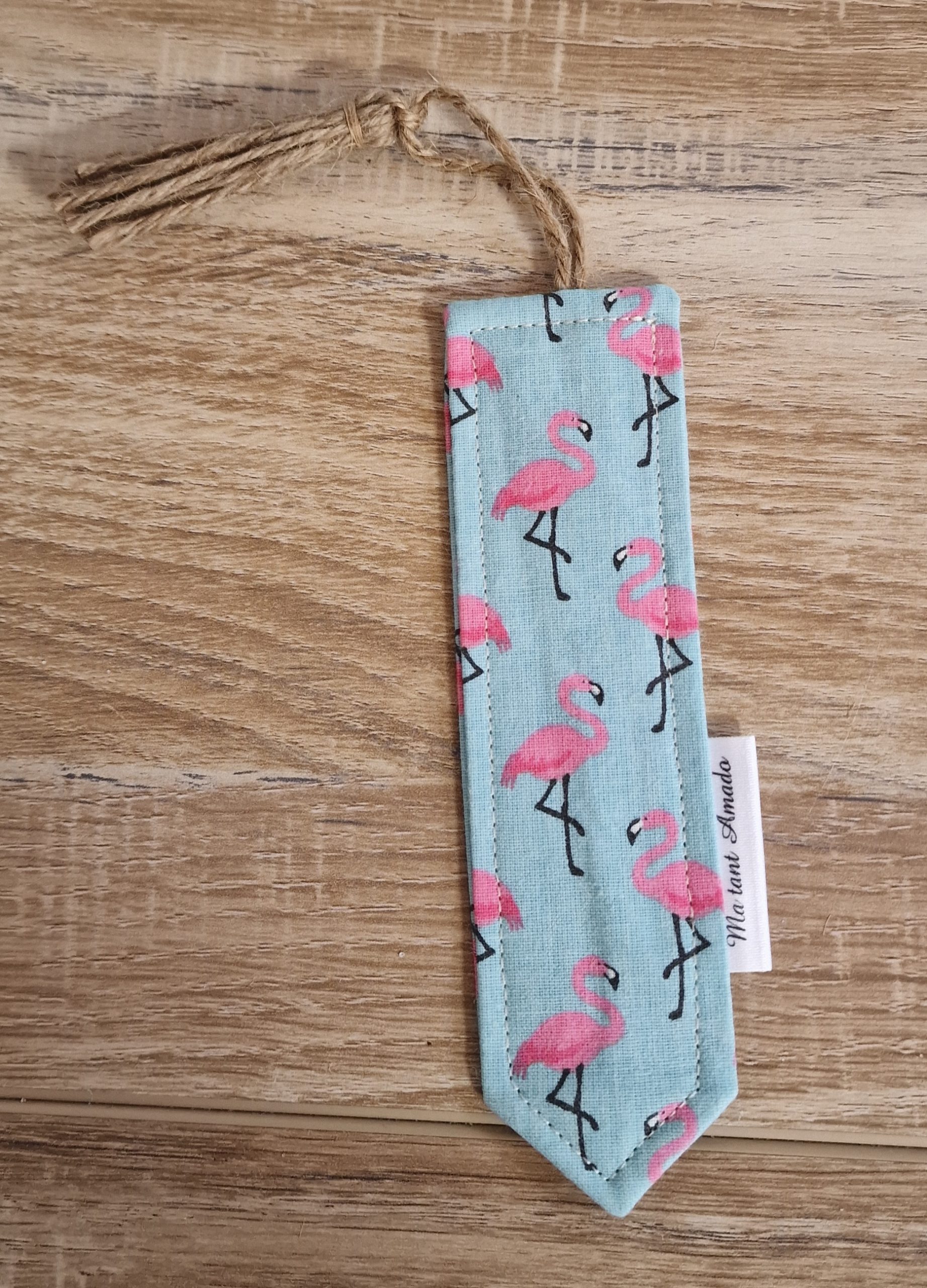 Sur le côté, une petite étiquette blanche « Ma tant Amado » vient signer cette création avec discrétion et style. Léger, souple et agréable au toucher, ce marque-page est pensé pour accompagner vos lectures avec personnalité, que ce soit dans un roman, un carnet ou un agenda.