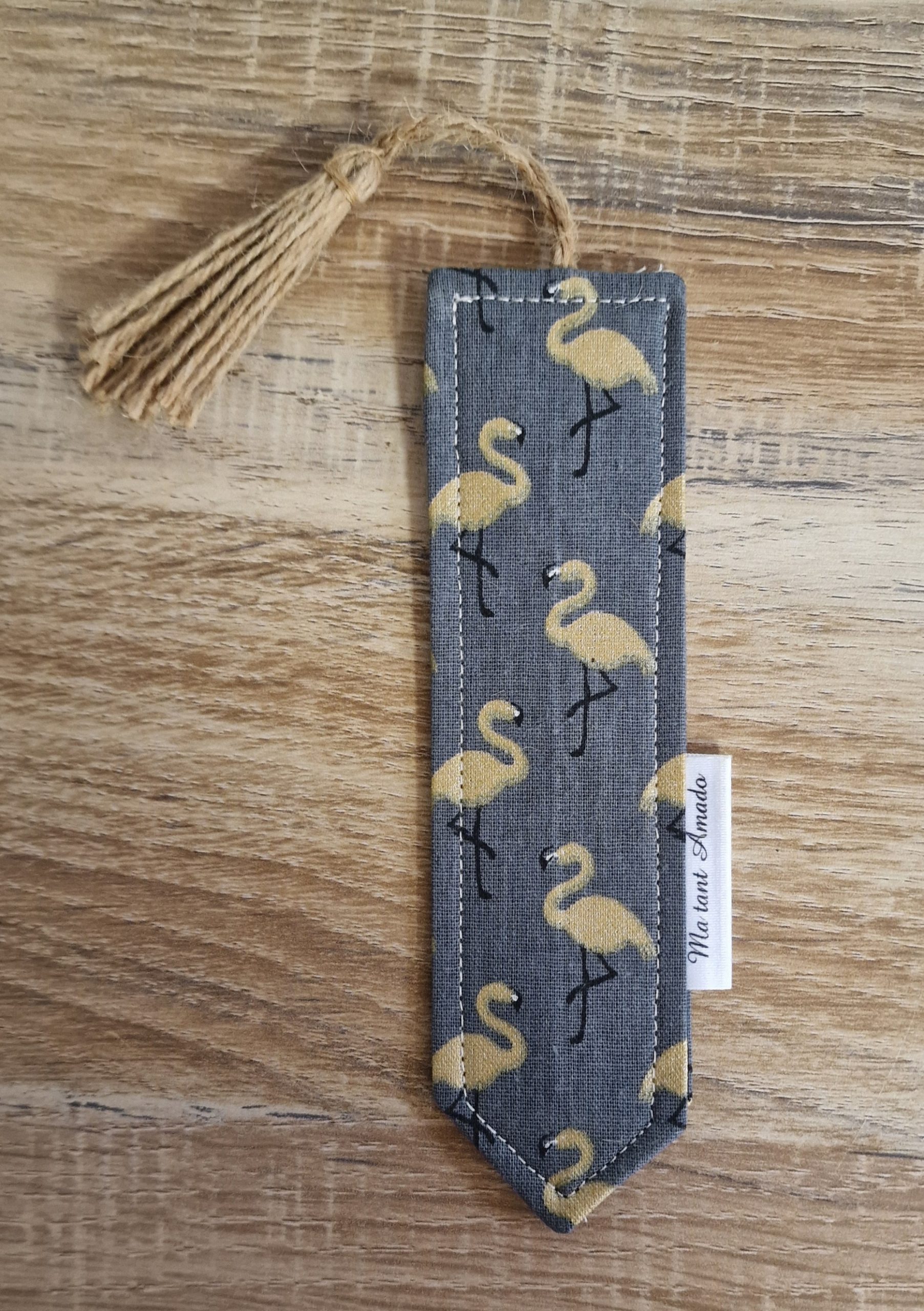 Marque-page en tissu avec motif flamant rose et chiffre graphique. Fait main, finition pointue et pompon en ficelle. Original, léger et idéal pour accompagner vos lectures.